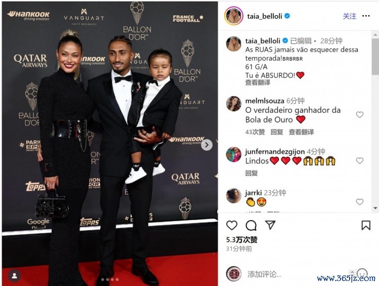 9月23日讯 拉菲尼亚妻子娜塔莉亚更新社媒动态,晒出与拉菲尼亚出席金球奖颁奖典礼的照片。