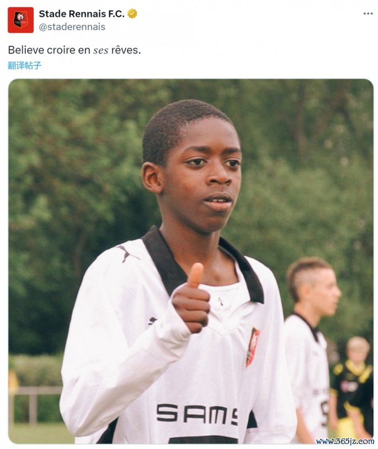 雷恩社媒晒出登贝莱儿时在俱乐部的照片, 游泳快讯英超直播配文:“相信自己的理想 。”