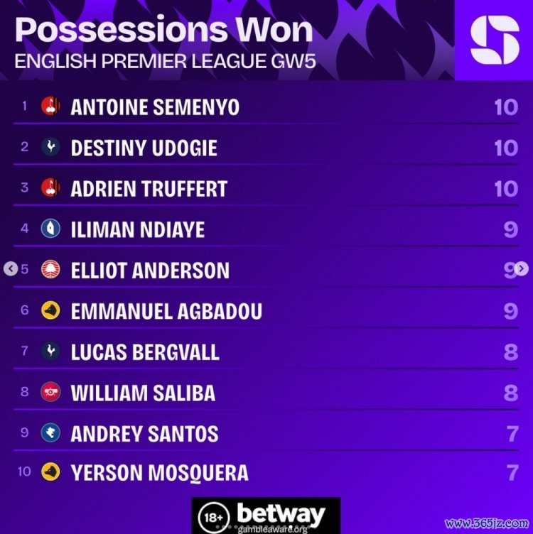 9月24日讯 英超第5轮战罢,squawkafootball列各项数据排行,德甲五大联赛塞梅尼奥、乌多吉、特吕费尔是本轮夺回球权次数最多的球员, 游泳快讯各有10次。