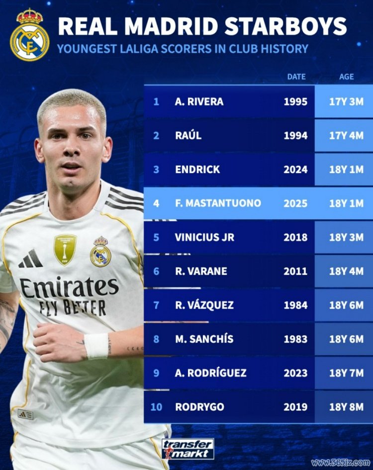 9月24日讯 在本轮西甲皇马4-1击败莱万特的赛事 中,马斯坦托诺破门, 游泳快讯体育赛事成为队史西甲破门第四年轻的球员, 网球新闻以下为具体榜单: