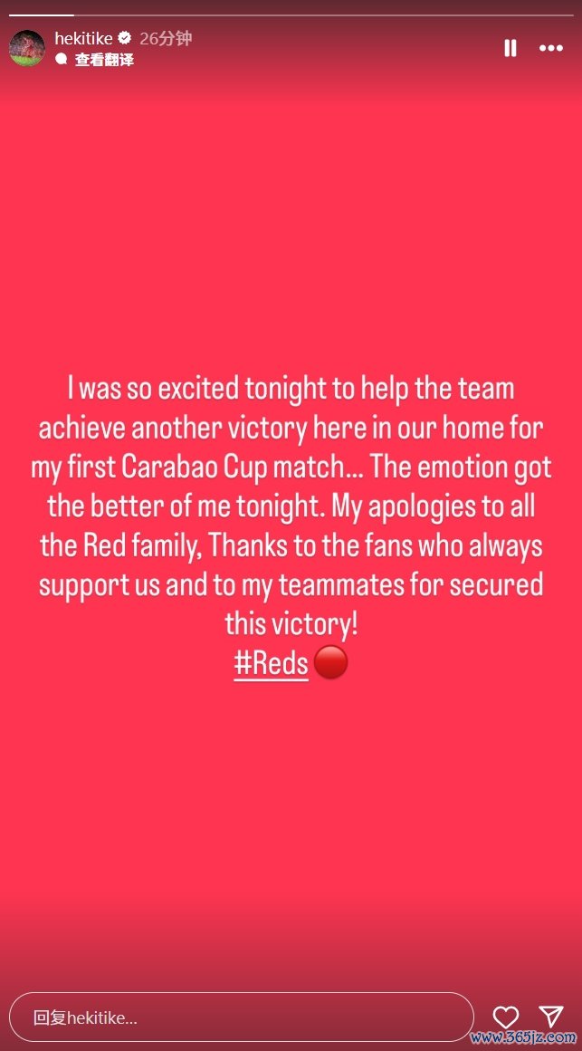 赛后, 游泳快讯西甲直播埃基蒂克在社媒向利物浦球迷道歉:“今晚能首次参加职业联赛 杯主场作战 赛事并帮助球队再夺获胜 , 网球新闻我无比激动……但今夜情绪确实有些失控。在此向所有红军大家庭致歉,也感谢一直支持我们的球迷,以及携手赢下赛事 的队友们!”