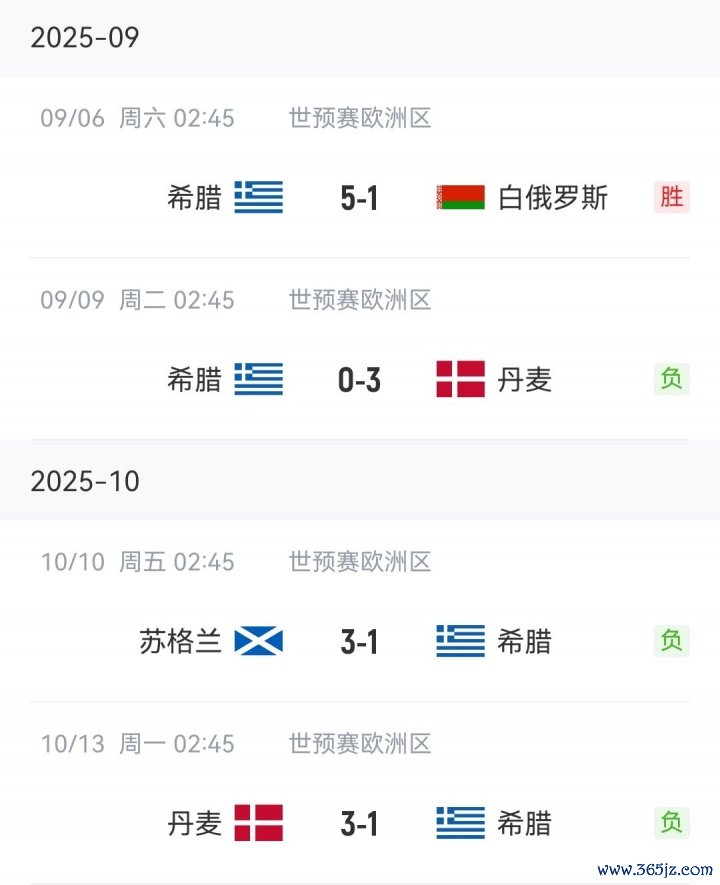 10月13日讯 在今天凌晨的欧洲区世预赛中,希腊客场应战 1-3不敌丹麦,无缘直通2026世界杯赛 。