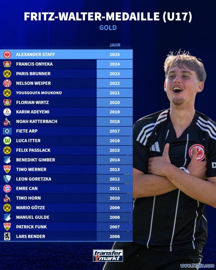 10月17日讯 法兰克福前场球员斯塔夫当选德国U17年度最佳新秀,德甲无插件直播德国转会市场列出了历届德国U17年度最佳新秀名单。