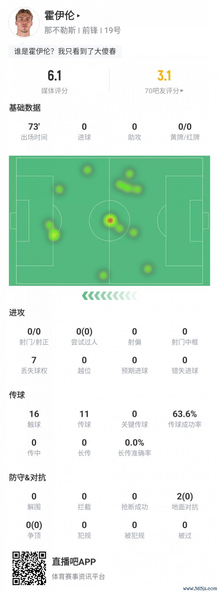 9月29日讯 那不勒斯在本轮意甲1-2输给米兰,霍伊伦杆位出场73分钟,德甲西甲直播以下是他的个人数据。