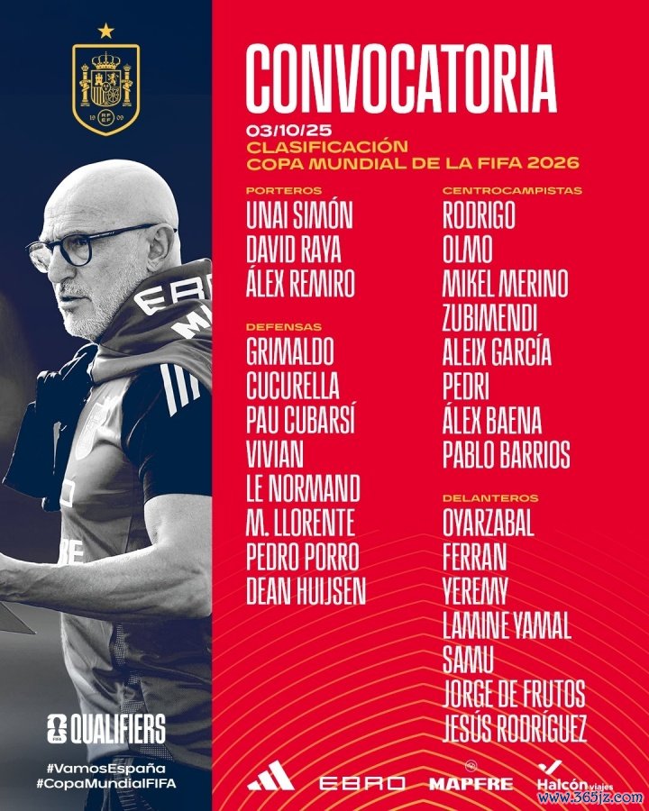 10月03日讯 西班牙队官方公布了最新一期的国家队大名单,亚马尔、佩德里领衔,德甲无插件直播苏维门迪、赫伊森等多人在列。卡瓦哈尔、费尔明等人因伤落选。这批球员将随西班牙出征10月份的两场世预赛欧洲区赛事 。