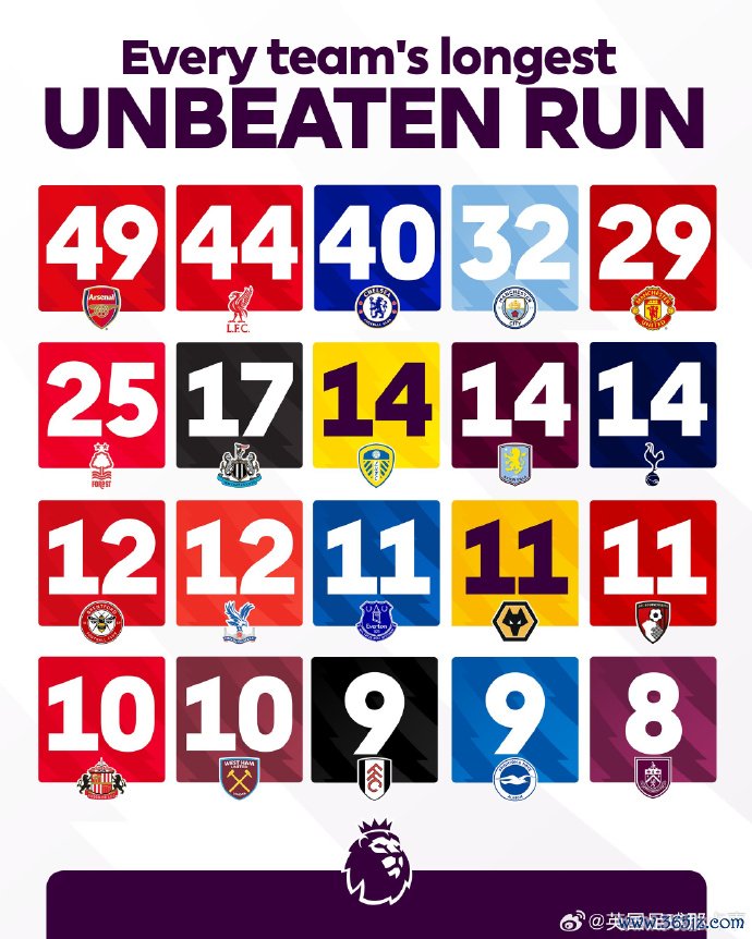 英超各队的最长连续不败场次一览 西甲积分榜2024-2025
