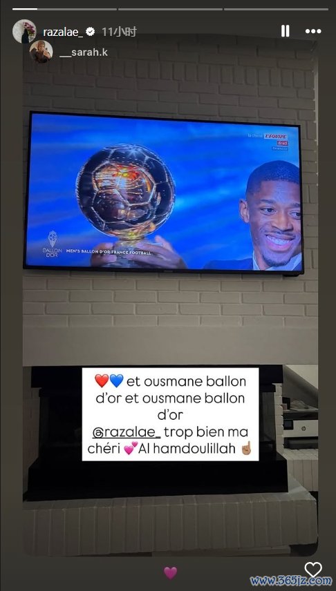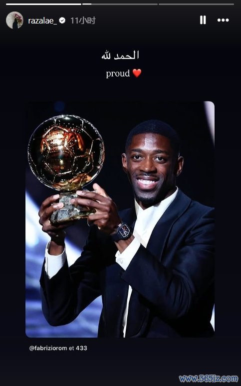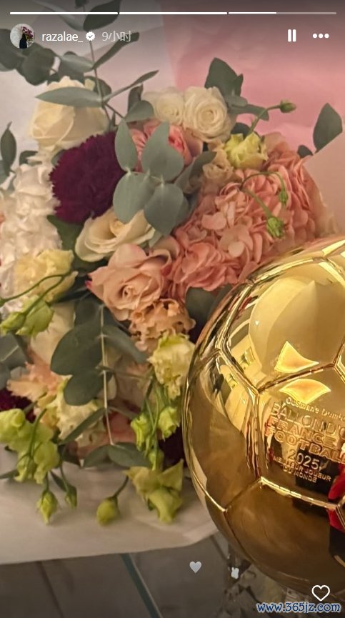 09月23日讯 登贝莱荣膺2025年金球奖,他的妻子Rima Edbouche在INS上晒出一束鲜花和金球奖奖杯图。