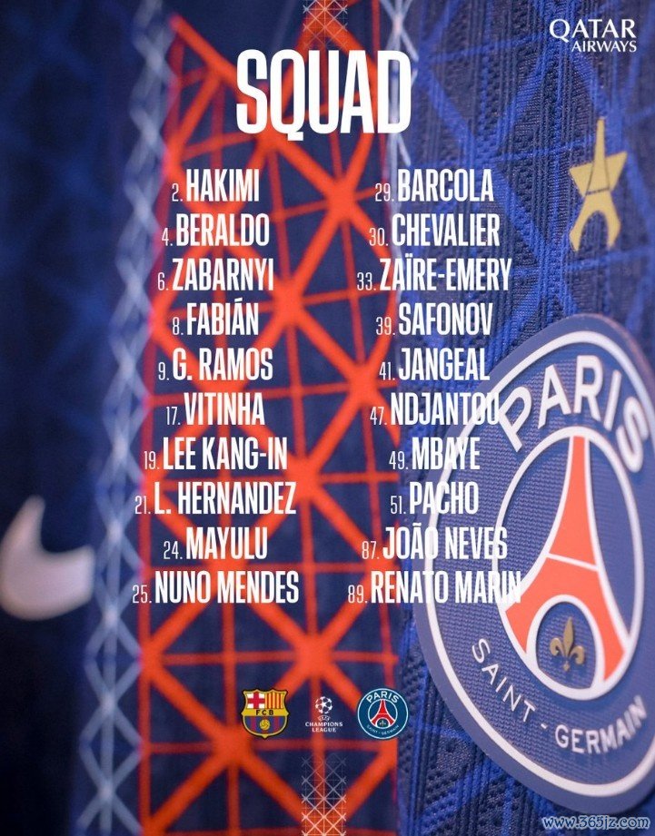 中场:8-法比安、17-维蒂尼亚、24-马尤卢、33-扎伊尔-埃梅里、87-内维斯