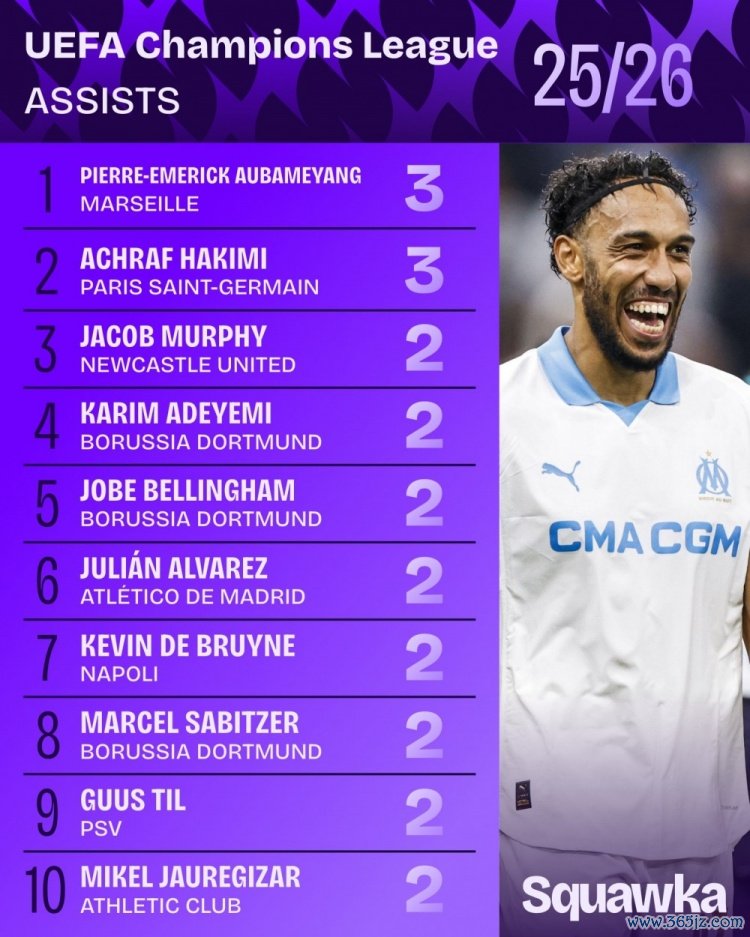 10月23日讯 本赛季欧冠联赛阶段已战罢3轮,Squawka统计了到目前为止的助攻榜,德甲足球直播马赛前锋奥巴梅扬和巴黎后卫阿什拉夫均是3次助攻, 游泳快讯分列前二。