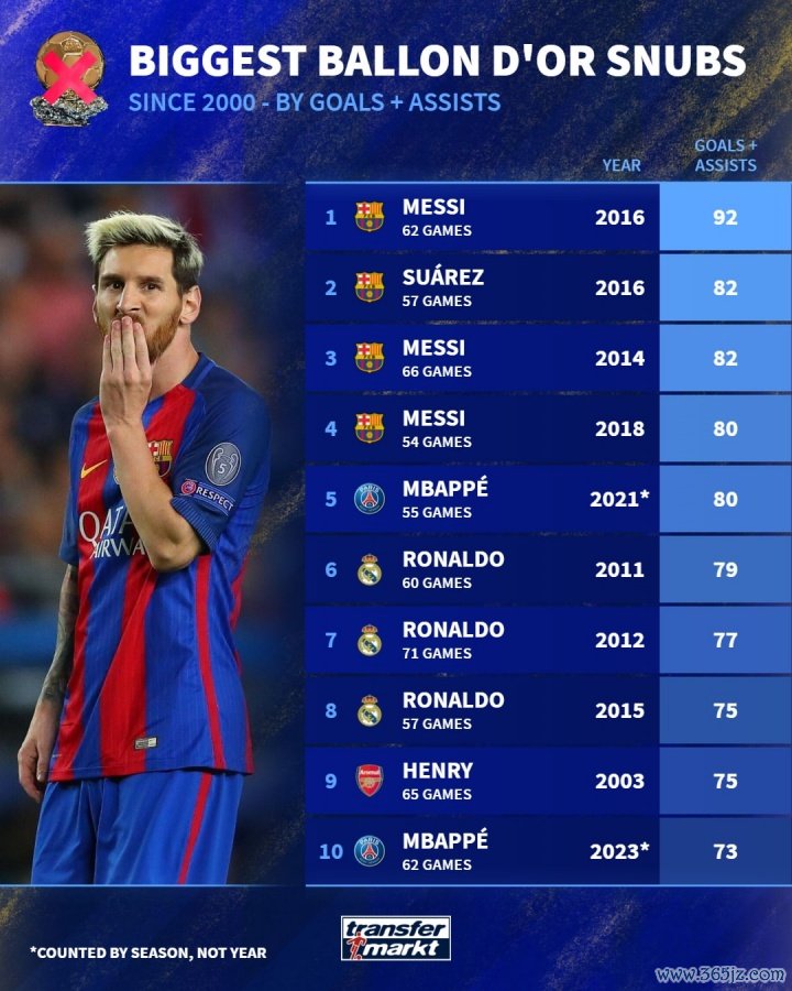 09月24日讯 德国转会市场盘点了各年份金球奖数据,德甲五大联赛排出了对应年份中无缘金球奖的最高得分 +助功 数据。以下是详细排名。
