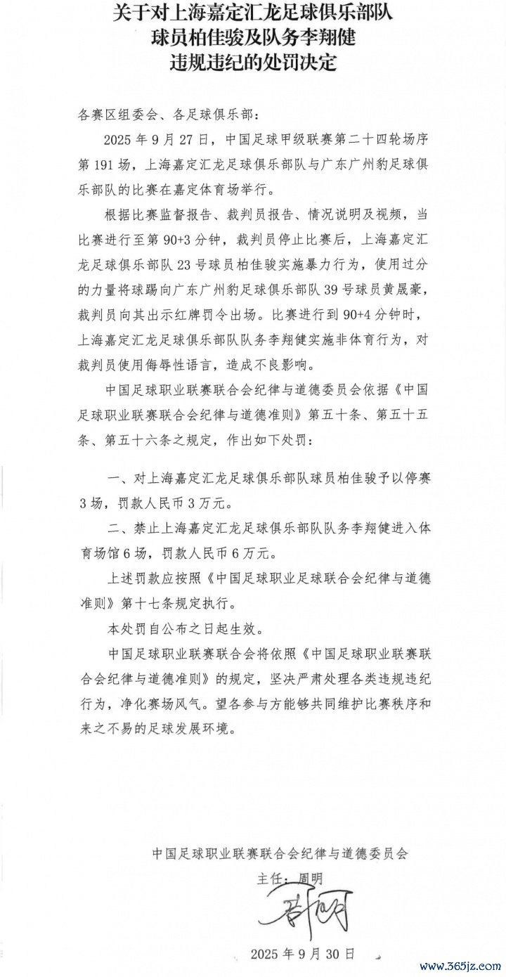 09月30日讯 中足联官方消息,上海嘉定汇龙球员柏佳骏实施暴力行为,禁赛3场罚款3万,上海嘉定汇龙队务侮辱裁判 ,德甲禁赛6场罚款6万。