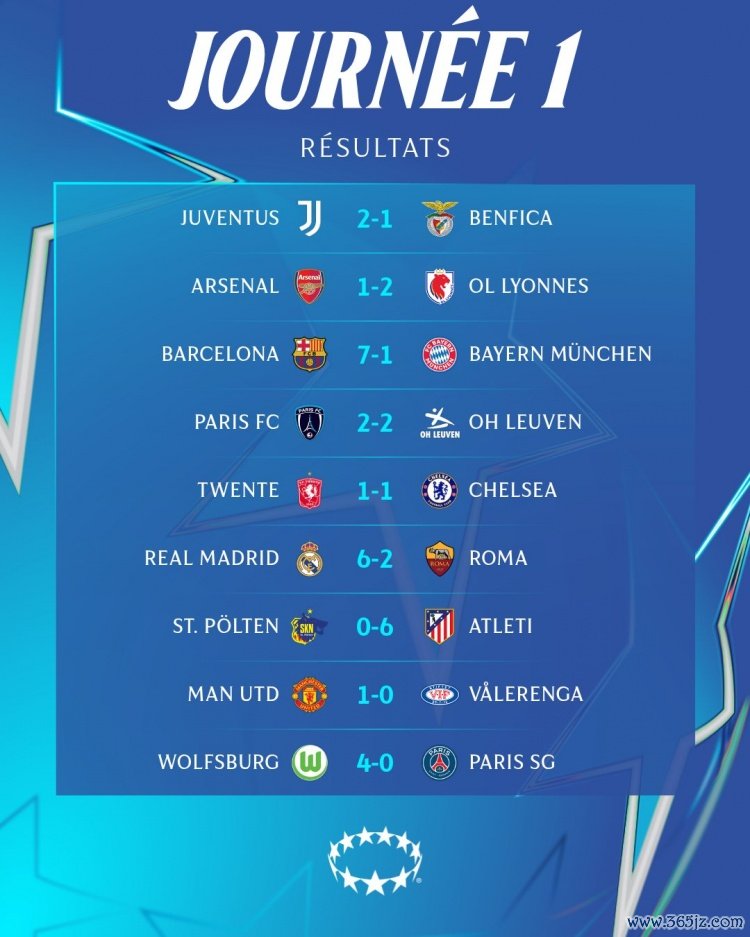 10月9日讯 女足欧冠职业联赛 阶段首轮赛事 战罢,巴萨7-1拜仁, 游泳快讯阿森纳1-2里昂, 网球新闻法甲直播皇马6-2罗马,德甲尤文、曼联皆取胜。