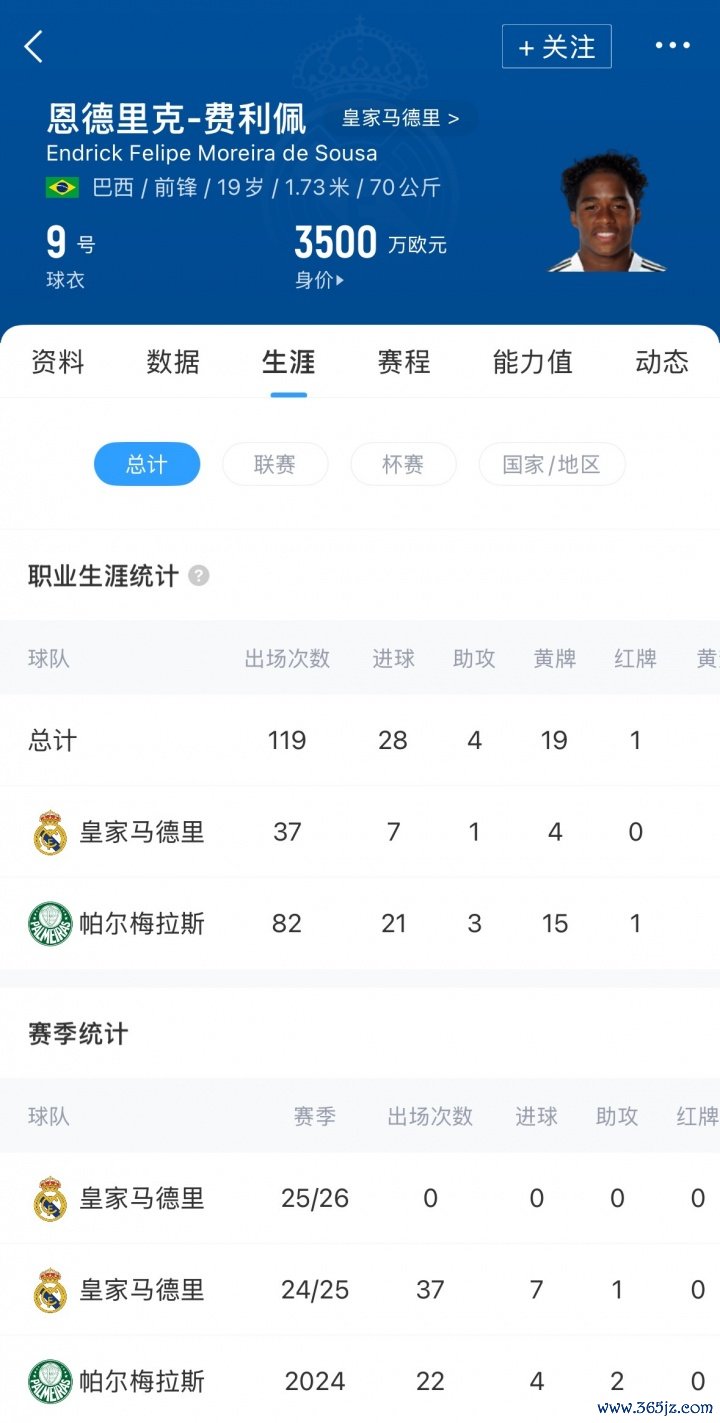 即使是对阵莱万特和凯拉特的赛事 ,恩德里克仍坐在后备 席,即便球队有巨大领跑 优势,他甚至都没有获得赛前热身 机会。恩德里克理想 着跟随巴西参加2026世界杯赛 ,但缺乏出场时间可能会让他与国家队大名单渐行渐远。最近一期巴西队名单,恩德里克则再次落选。