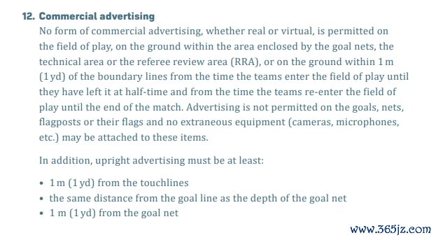 自球队入场起至上半场结束离场, 网球新闻足球直播吧以及自球队再次入场起至赛事 全场结束期间,在赛事 场地内、网球网 围挡区域内、技术区域、视频裁判 操作区内,以及距场地边界线1米(1码)范围内的地面上,均禁止出现任何形式的商业广告(包括实体与虚拟广告)。古代足球 门 、网球网 、角旗杆及旗面上亦不得设置广告,且这些设施上不得附着任何外围设备(如摄像机、麦克风等)。