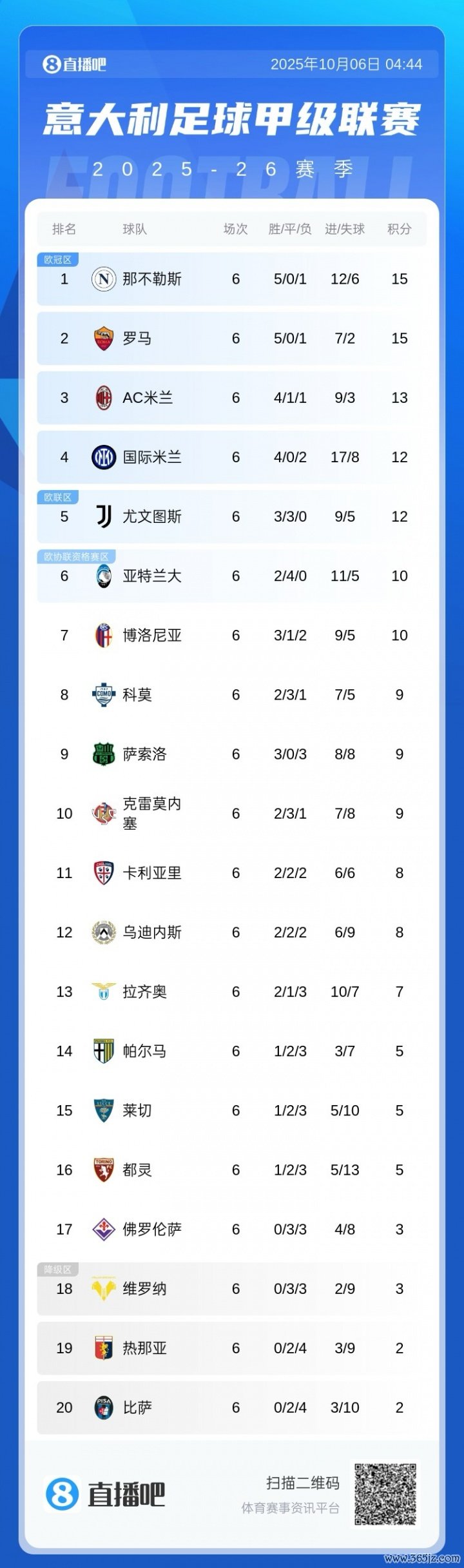 10月06日讯 意甲第6轮赛事 全部结束,罗马客场应战 2-1佛罗伦萨, 游泳快讯那不勒斯2-1反转 热那亚, 网球新闻体育赛事尤文0-0米兰双方握手言和c罗加盟申花已确定,德甲最新积分榜如下: