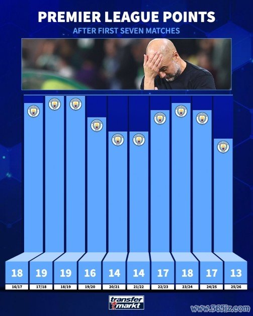 10月6日讯 英超第7轮赛事 ,曼城客场应战 1-0战胜布伦特福德。德国转会市场统计了瓜迪奥拉执教曼城赛季前7轮赛事 的积分,德甲五大联赛本赛季13分革新 低。