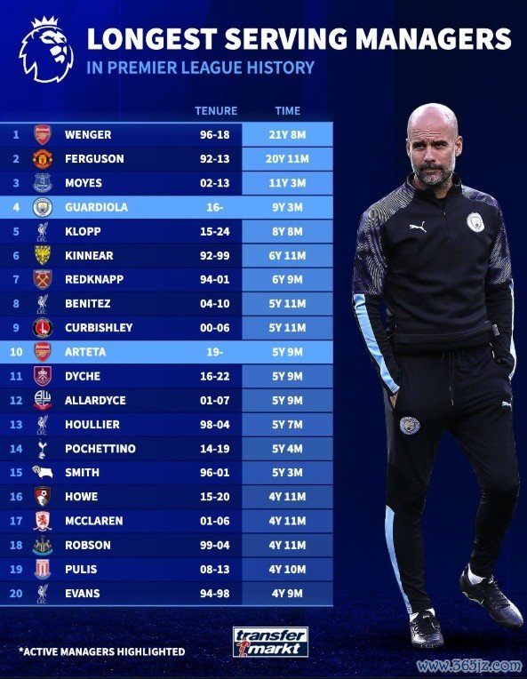 10月9日讯 德转列出了英超历史上的主帅任职时长榜,温格、弗格森前二, 游泳快讯体育赛事瓜迪奥拉第四, 网球新闻克洛普第五。
