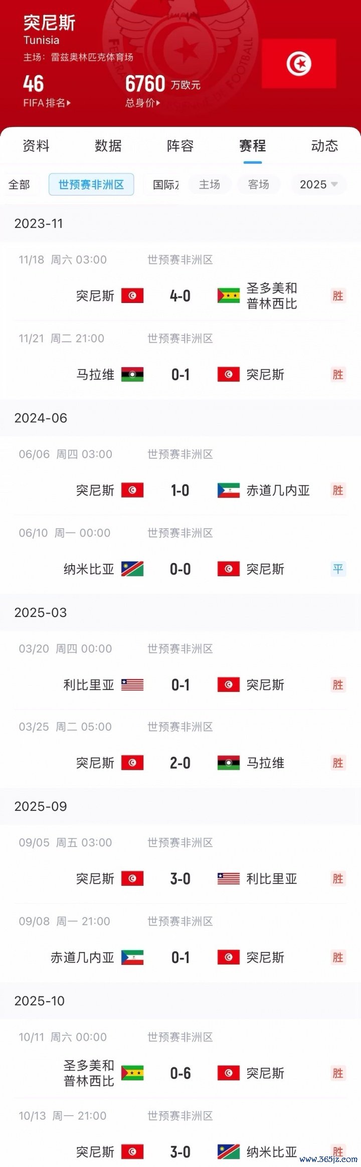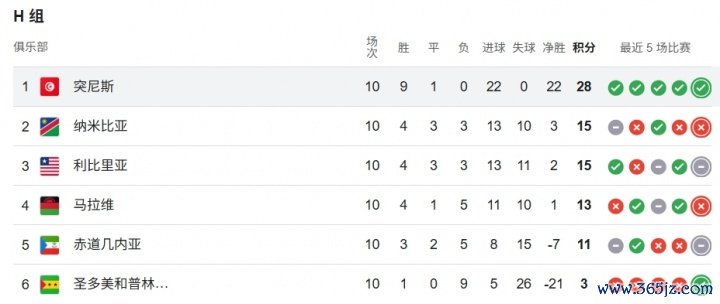 10月13日讯 世预赛非洲区小组赛H组今天结束了最后一轮的全部较量,最终突尼斯以10轮28分,进22球失0球的无解战绩小组第一收官。